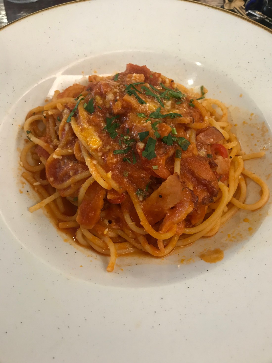 From the Menu: Diced Bacon, Napoli Sauce, Red Wine and Chilli (best served with spaghetti which I had)